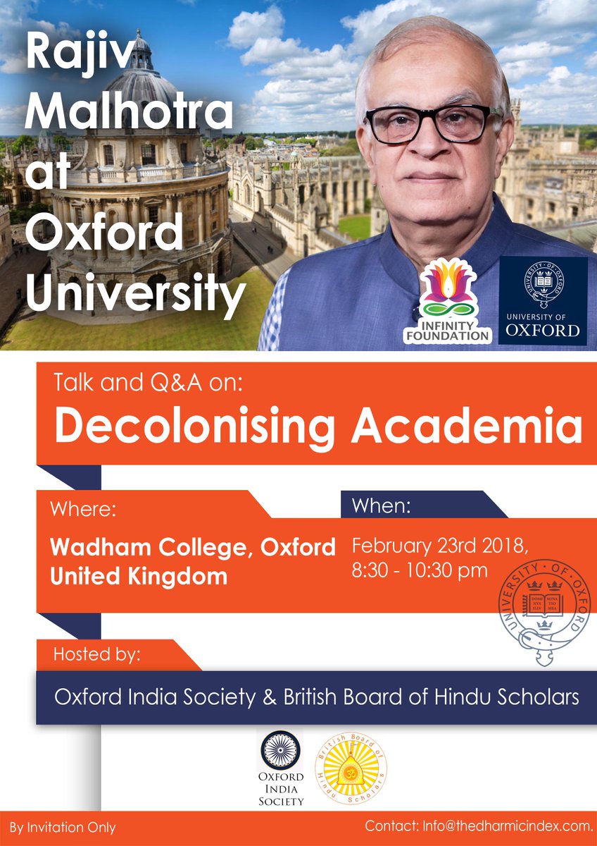 VENUE UPGRADE for Rajiv Malhotra’s Oxford Talk Title: DECOLONIZING ACADEMIA Venue: Randolph Hotel Ballroom, Beaumont St., Oxford 7 pm – Tea, Coffee, Snacks. 7:30 pm – Talk followed by Q&A February 23, 2018, Register: http://www.TheDharmicIndex.com Contact: Info@TheDharmicIndex.com